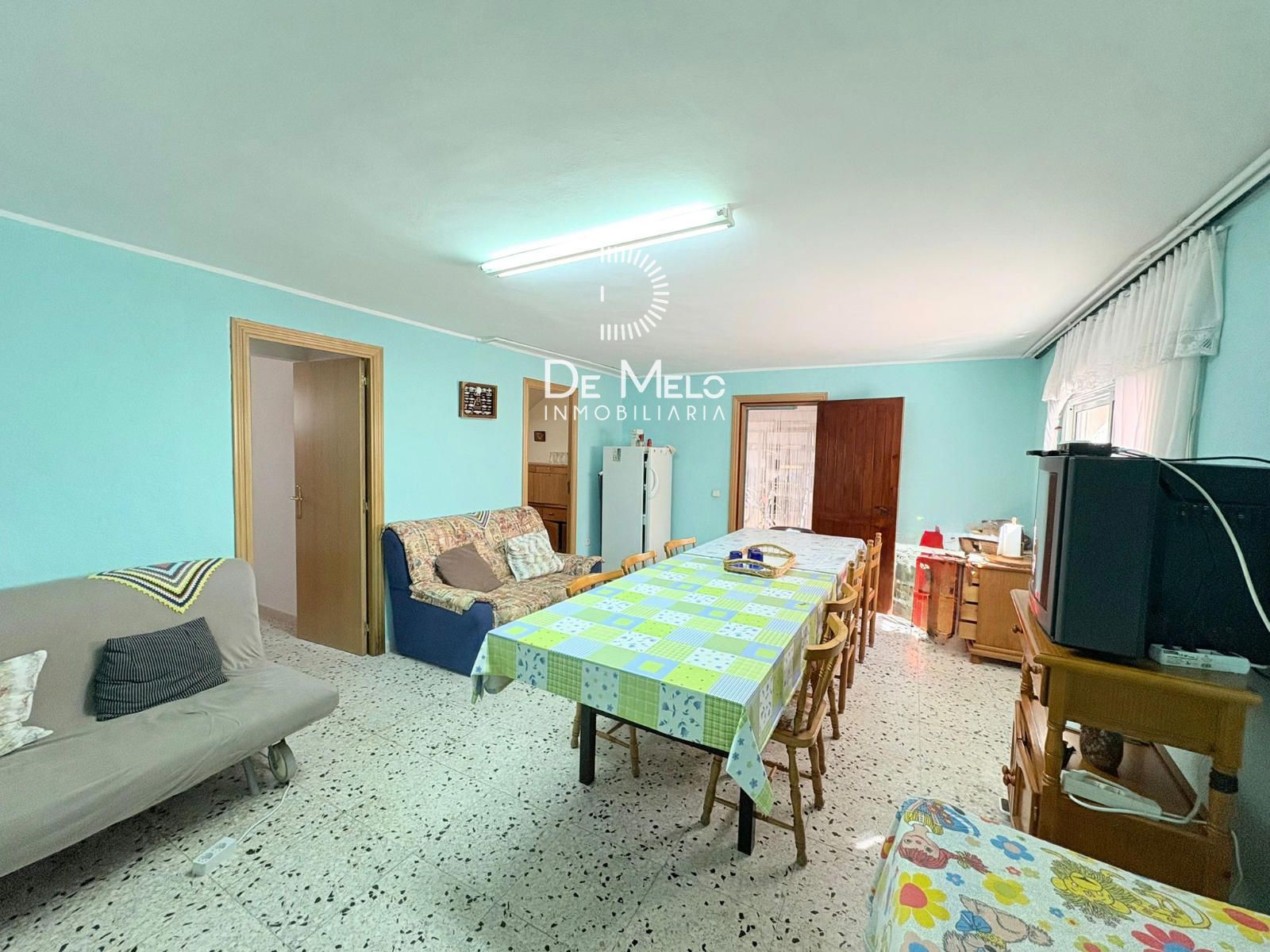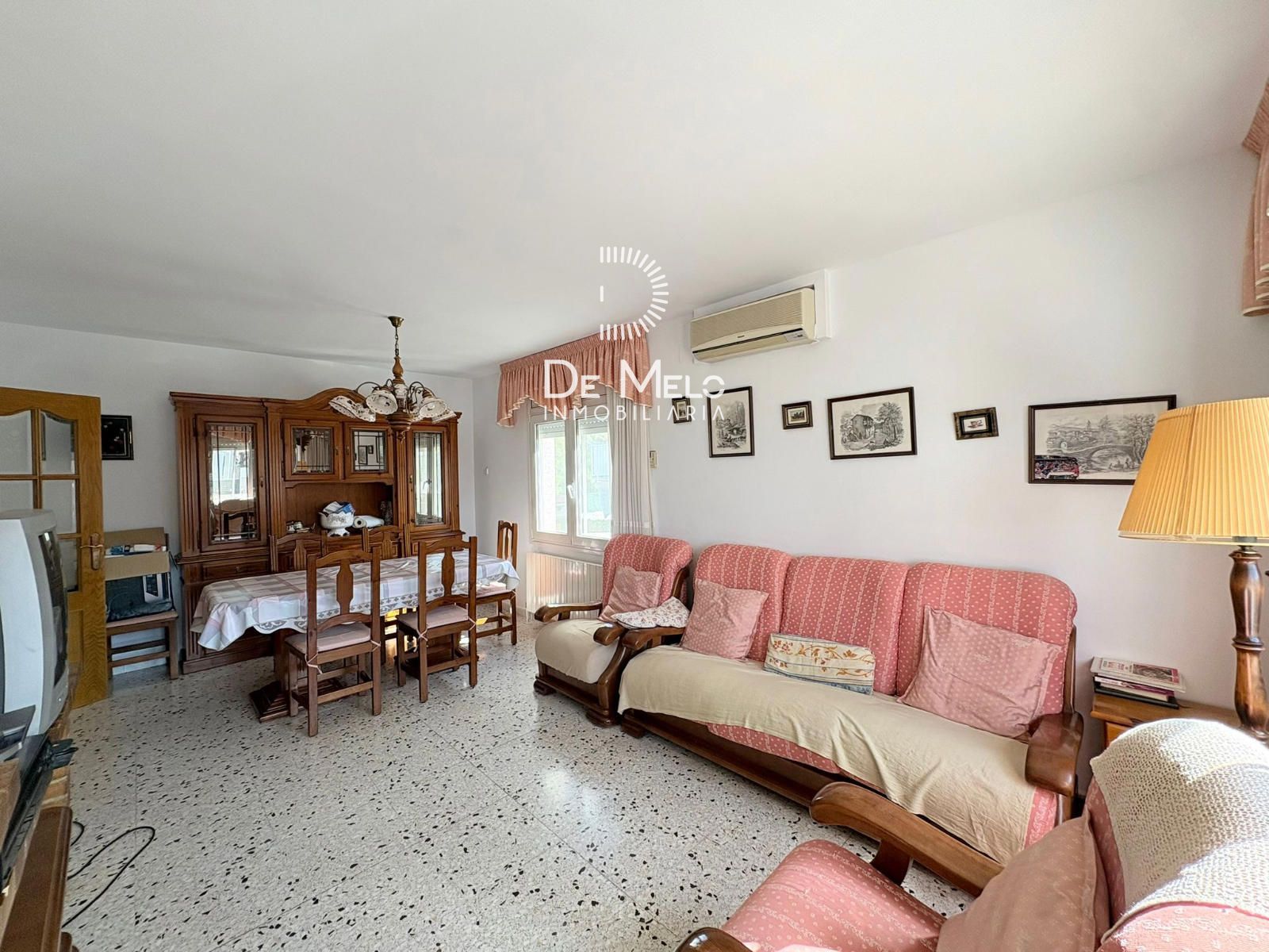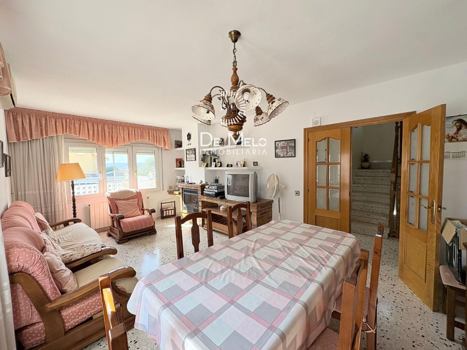 Salón-comedor amplio y luminoso, equipado con aire acondicionado y chimenea, perfecto para disfrutar todo el año.